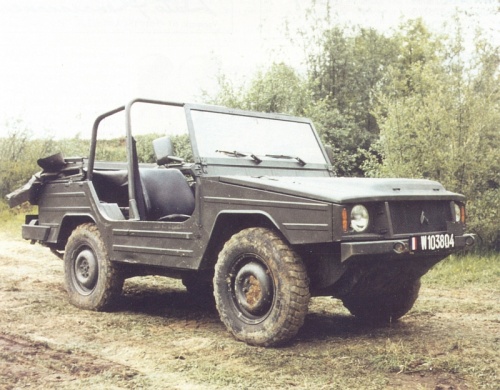 Die französische Armee wollte in der zweiten Hälfte des siebziger Jahre über ein modernes Geländefahrzeug verfügen, und folglich entschloß sich die betreffende Dienststelle des Verteidigungsministeriums eine Anzahl solcher Fahrzeuge ausländischer Fabrikate zu kaufen. Die wurden dann auf französischen Truppenübungsplätzen eingesetzt, auch auf dem bei uns Holländern bekannten La Courtine. Die drei großen einheimischen Autofabriken wurden dann eingeladen jeweils eines dieser Modelle zu adoptieren; man hatte die Auswahl zwischen italienischen, englischen, amerikanischen und sogar japanischen Erzeugnissen, und man sollte durch Einsatz eines eigenen Motors (und natürlich mit einem französischen Markenemblem vorne drauf) das Auslandsprodukt derart französisch machen, daß das französische Heer damit international eine gute Figur machte. Oder man konnte auch mit Eigenentwicklungen kommen. Renault/Saviem optierte für den Fiat Campagnola (eigentlich verwunderlich, denn damals herrschte schon eine enge Zusammenarbeit zwischen Fiat und Citroën, was dann zu dem erfolgreichen Lieferwagen C35 führte), Peugeot liebäugelte mit dem Mercedes G (=Geländewagen), Citroën aber sah die größten Chancen im soeben vorgestellten Volkswagen Iltis, den man nicht nur äußerlich als Neffe des DKW Munga sehen kann.