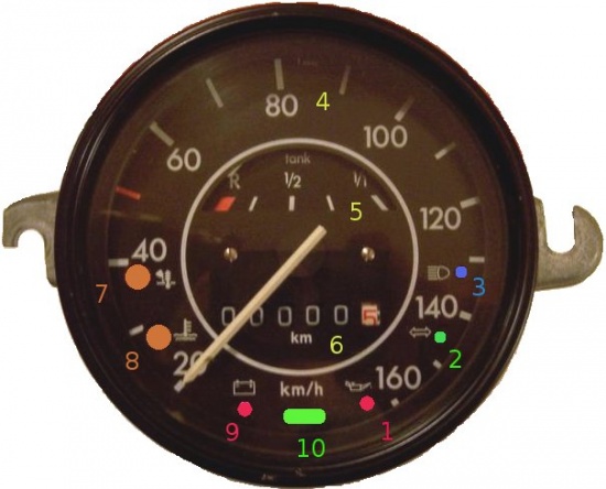 Bei dem im Iltis verbauten Tacho handelt es sich um einen vom VW Käfer abgeleiteten mechanischen Wirbelstrom- Tachometer. Angezeigt wird neben der Geschwindigkeit [4] die zurückgelegte Wegstrecke[6], der Tankinhalt[5] und über Anzeigeleuchten [1-3 und 7-10] weitere Betriebszustände des Fahrzeugs. Um den Tachometer zu schützen ist dieser mit einer schwarzen Kunststoffverkleidung umgeben.