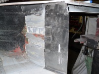 Das kleine Loch in der vom Innenraum her sichtbaren Falz ist mit Absicht entstanden. Wenn das Bodenblech eingesetzt ist dient dieses Loch als Wasserablauf. Sieht doch schon ganz ordentlich aus. Von innen verschleifen und erst mal mit Zinkspray abdecken als Vorbereitung für die nächsten Schritte.