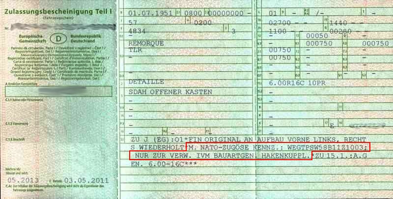 13:41, 15. Apr. 2013 | ![]() | 800 × 405 (118 KB) | Lillifee (Diskussion | Beiträge) | Zulassungsbescheinigung Teil I - Anhänger mit NATO-Zugöse |