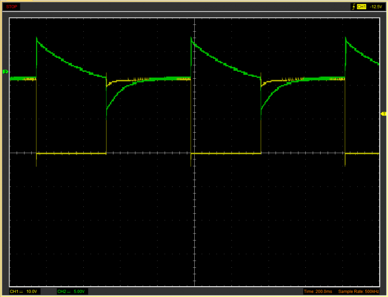 aktuell | 09:05, 7. Mai 2017 | 1.140 × 873 (23 KB) | Slothorpe (Diskussion | Beiträge) | Blinkrelais Iltis, Messung an Messpunkt 5, Belastung 42W, Kanal 1: 10V/div, Kanal 2: 5V/div, Messung gegen +24V |