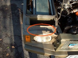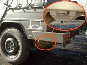 Einbauort: Beifahrerseite an der Spritzwand oben.Hier ist die Fahrgestellnummer abzulesen. Es sind drei verschiedene Typenschilder bekannt: rein silber, silber/schwarz und wie hier gezeigt schwarz Daneben im Beifahrerstaukasten befindet sich bei Bundeswehrfahrzeugen an der Spritzwand das Versorgungsnummernschild. Hier gibt es drei verschiedene Versorgungsnummern: