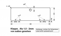 Dann rundet man die Ecken des Alublechs ab und bohrt die Löcher, siehe Abb.3. Achtung, je nach den Maßen des Briefkastenschlosses und der Scharniere kann die Lage der Löcher anders sein als auf der Skizze! Der Riegel des Schlosses soll über den Rand der Aluplatte 3 - 5mm herausragen. Die Lage der Löcher für die Innenflügel der Scharniere ist so gewählt, daß die Außenflügel nicht die Bohrungen des Stahlblechstreifens unter dem Knieschutz verdecken. Abb.3 gibt die Lage der Löcher für meine Scharniere mit den Außenmaßen 50 x 25mm an. Achtung: wegen der Lochlage beim Knieschutz sind die Löcher etwas asymmetrisch. Siehe auch Punkt 4!